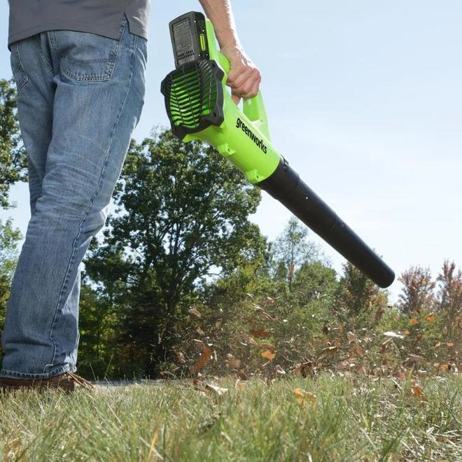 The Greenworks axial leaf blower is ideal for the homeowner wishing to keep smaller outdoor spaces tidy. The 24 V lithium-ion will allow you to complete your chores with up to 11 minutes of runtime on high without bad odours and pollutants. This light and easy-to-use blower features a variable speed trigger and comfortable mould over grip reducing user fatigue. This leaf blower includes a 2.0 Ah battery with a charger offering a full recharge in just 45 minutes. The battery is compatible with many Greenworks 24 V products for lawn and garden maintenance. Backed by a 3-year warranty.
